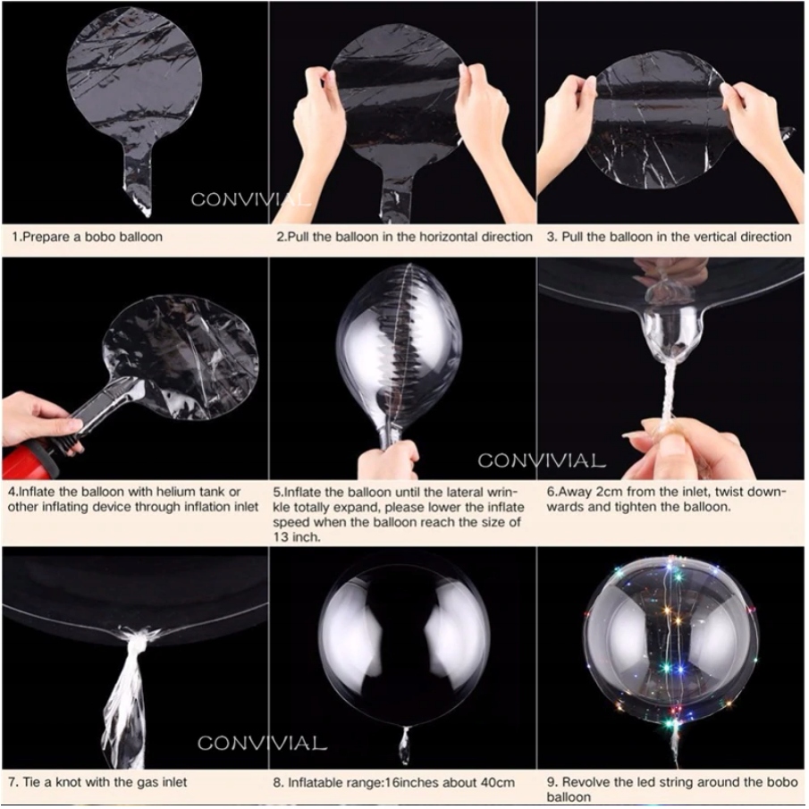 Przed przystąpieniem do pompowania rozciągnij balon poprzez naciągnięcie go kilkukrotnie wzdłuż i wszerz. Teraz możesz napełnić balon za pomocą pompki bądź helem. Po zakończeniu pompowania należy dokładnie zawinąć końcówkę balona, tak aby nie wydostawało się z niego powietrze. Następnie umieść balon w zacisku. Drucik z diodami LED powinien zostać przewinięty dookoła plastikowej rurki, a następnie owinięty dookoła balonu. Ostatnim krokiem jest umieszczenia trzech sztuk baterii AA 1,5V w przeznaczonym do tego miejscu oraz przesunięcie włącznika ON/OFF.