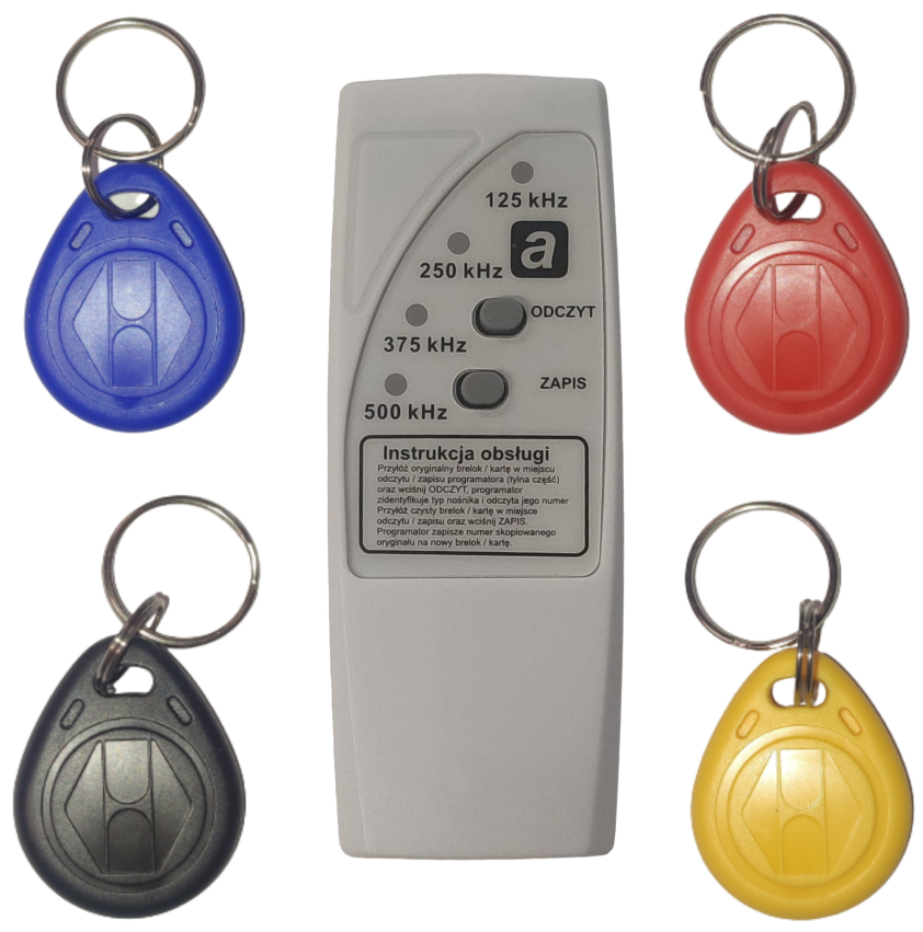 KOPIARKA PROGRAMATOR DUPLIKATOR BRELOKÓW RFID 125kHz, 250kHz, 375kHz, 500kHz + 4 BRELOKI RFID (CHIP PROGRAMOWALNY EM4305) W ZESTAWIE.