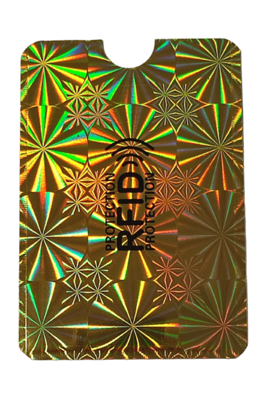 Etui ochronne - antykradzieżowe zabezpieczające karty płatnicze, kredytowe, identyfikacyjne w kolorze złoto-żółtym.