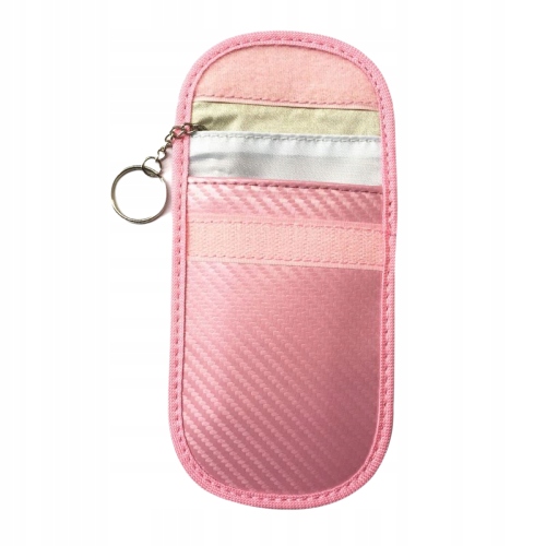 Eleganckie etui w kolorze różowym, do kluczyków samochodowych, kart bankomatowych, płatniczych i kredytowych wykonane ze specjalnego tworzywa blokującego fale radiowe.