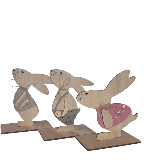 Przedmiotem sprzedaży jest zestaw 3 zajączków (wykonanych z drewnianej sklejki) do dekoracji wielkanocnej, wspaniałej ozdoby domu bądź dekoracji stołu wielkanocnego.