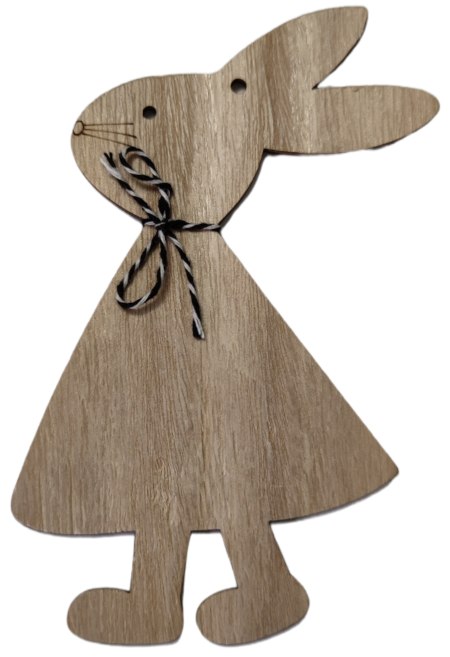 Zajączek wykonany jest z naturalnego drewna z biało czarnm sznureczkiem zawiązanym na kokardkę.