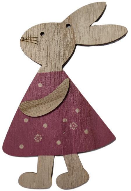 Zajączek wykonany jest z naturalnego drewna z namalowaną na ciemno różowo sukienką.