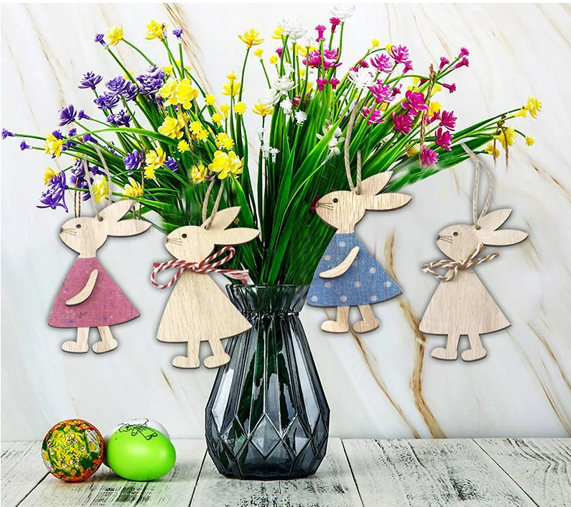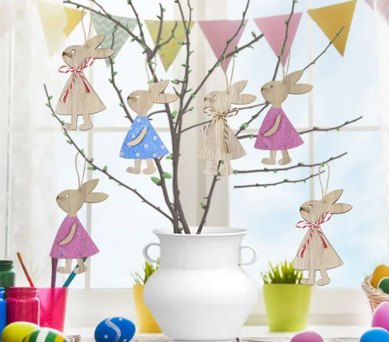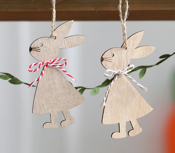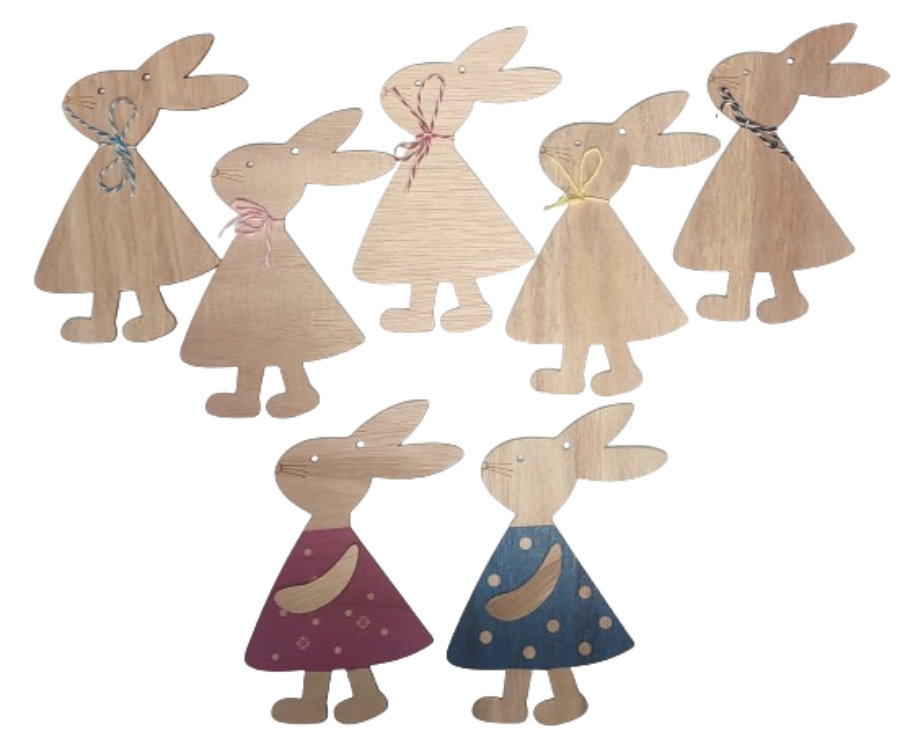 Zajączki wykonane są z naturalnego drewna, a pięć z nich posiada kokardki wykonane z naturalnego sznureczka.