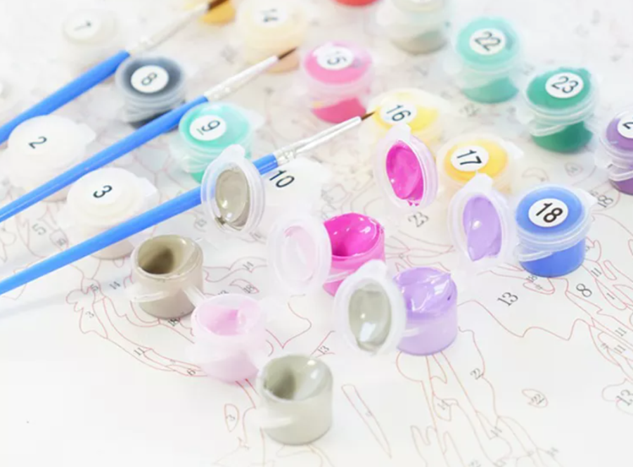 komplet nie szkodliwych farb akrylowych. Farby rozlane są do indywidualnych pojemników, z których każdy posiada swój numer.Wszystkie farby w komplecie DIY dobrane są w taki sposób, że nie wymagają mieszania, zatem są gotowe od razu do naniesienia. Liczba kolorów i odcieni farb zależy od złożoności obrazu i może osiągnąć aż 50 różnych kolorów.