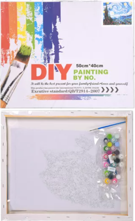 komplet nie szkodliwych farb akrylowych. Farby rozlane są do indywidualnych pojemników, z których każdy posiada swój numer.Wszystkie farby w komplecie DIY dobrane są w taki sposób, że nie wymagają mieszania, zatem są gotowe od razu do naniesienia. Liczba kolorów i odcieni farb zależy od złożoności obrazu i może osiągnąć aż 50 różnych kolorów.