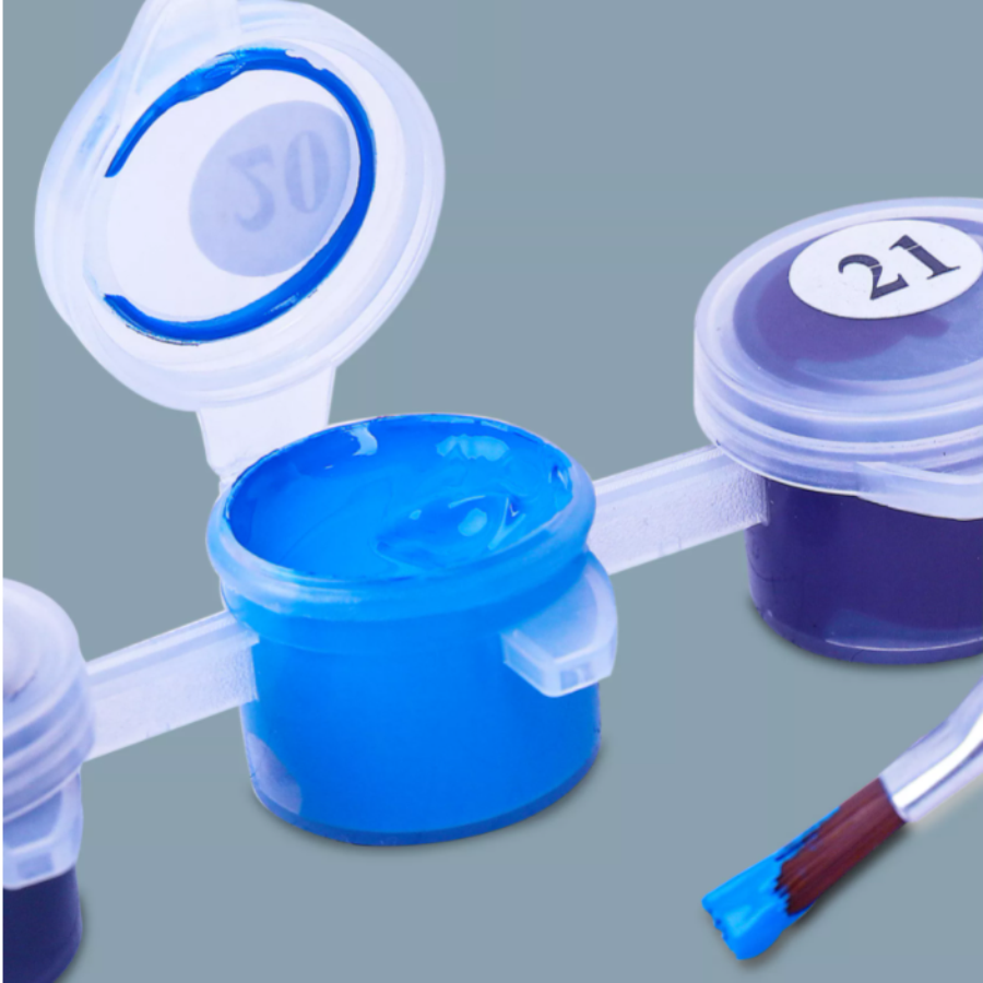 komplet nie szkodliwych farb akrylowych. Farby rozlane są do indywidualnych pojemników, z których każdy posiada swój numer.Wszystkie farby w komplecie DIY dobrane są w taki sposób, że nie wymagają mieszania, zatem są gotowe od razu do naniesienia. Liczba kolorów i odcieni farb zależy od złożoności obrazu i może osiągnąć aż 50 różnych kolorów.