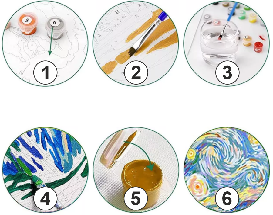 komplet nie szkodliwych farb akrylowych. Farby rozlane są do indywidualnych pojemników, z których każdy posiada swój numer.Wszystkie farby w komplecie DIY dobrane są w taki sposób, że nie wymagają mieszania, zatem są gotowe od razu do naniesienia. Liczba kolorów i odcieni farb zależy od złożoności obrazu i może osiągnąć aż 50 różnych kolorów.
